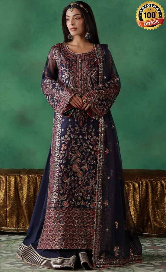 - Embroidered front center panel on deep purple javeria net