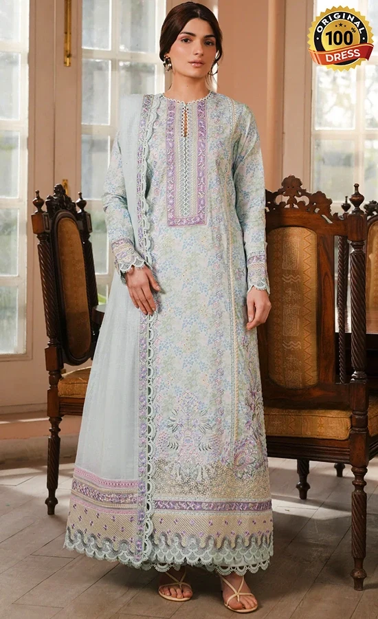 - Digital printed embroidered front center panel 1 pc powder blue printed lawn